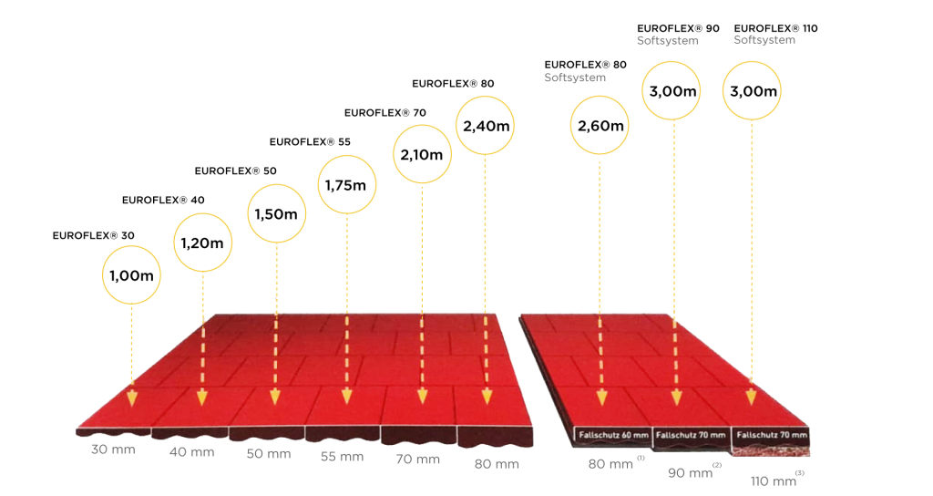 Los pisos flexibles/elásticos que ofrece ARGAMEDON S.A. cubren todas las necesidades de seguridad para las áreas de juegos de niños. La norma DIN EN 1177:2008 establece que a partir de alturas de 0.60m, se debe aplicar la norma HIC (Head Injury Criterion). La protección física de los niños es la más alta prioridad cuando de pisos para estas áreas se trata. Para ello disponemos de sistemas desde 15 hasta 110mm de espesor.